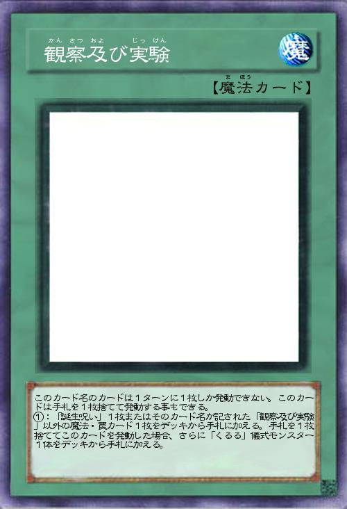 | このカード名のカードは1ターンに1枚しか発動できない。このカードは手札を1枚捨てて発動する事もできる。 ①:「誕生呪い」1枚またはそのカード名が記された「観察及び実験」以外の魔法・罠カード1枚をデッキから手札に加える。手札を1枚捨ててこのカードを発動した場合、さらに「くるる」儀式モンスター1体をデッキから手札に加える。 | |||