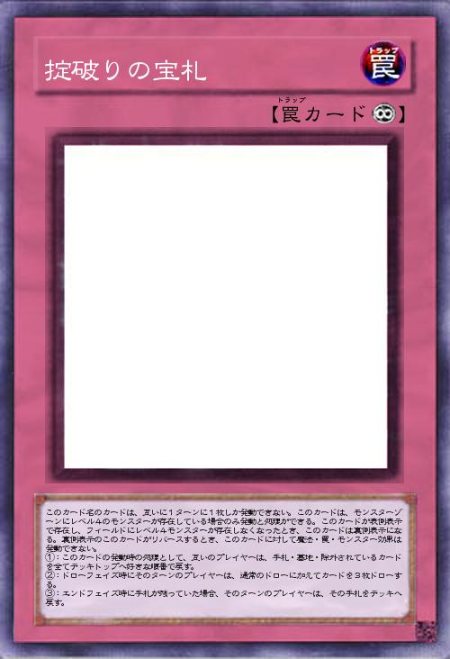 | このカード名のカードは、互いに1ターンに1枚しか発動できない。このカードは、モンスターゾーンにレベル4のモンスターが存在している場合のみ発動と処理ができる。このカードが表側表示で存在し、フィールドにレベル4モンスターが存在しなくなったとき、このカードは裏側表示になる。裏側表示のこのカードがリバースするとき、このカードに対して魔法・罠・モンスター効果は発動できない。 ①:このカードの発動時の処理として、互いのプレイヤーは、手札・墓地・除外されているカードを全てデッキトップへ好きな順番で戻す。 ②:ドローフェイズ時にそのターンのプレイヤーは、通常のドローに加えてカードを3枚ドローする。 ③:エンドフェイズ時に手札が残っていた場合、そのターンのプレイヤーは、その手札をデッキへ戻す。 | |||