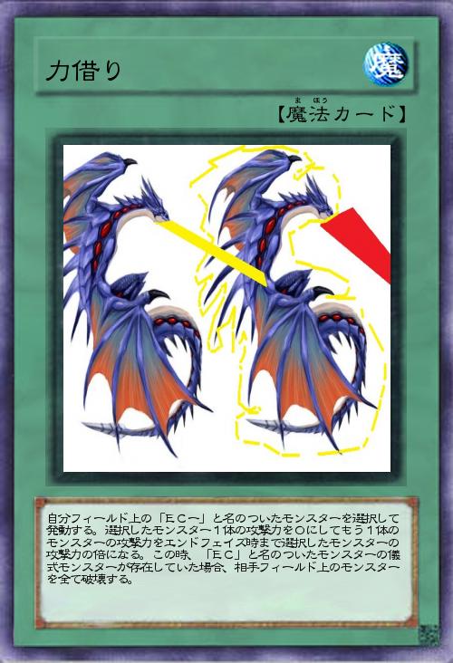 | 自分フィールド上の「ECー」と名のついたモンスターを選択して発動する。選択したモンスター1体の攻撃力を0にしてもう1体のモンスターの攻撃力をエンドフェイズ時まで選択したモンスターの攻撃力の倍になる。この時、「EC」と名のついたモンスターの儀式モンスターが存在していた場合、相手フィールド上のモンスターを全て破壊する。 | |||