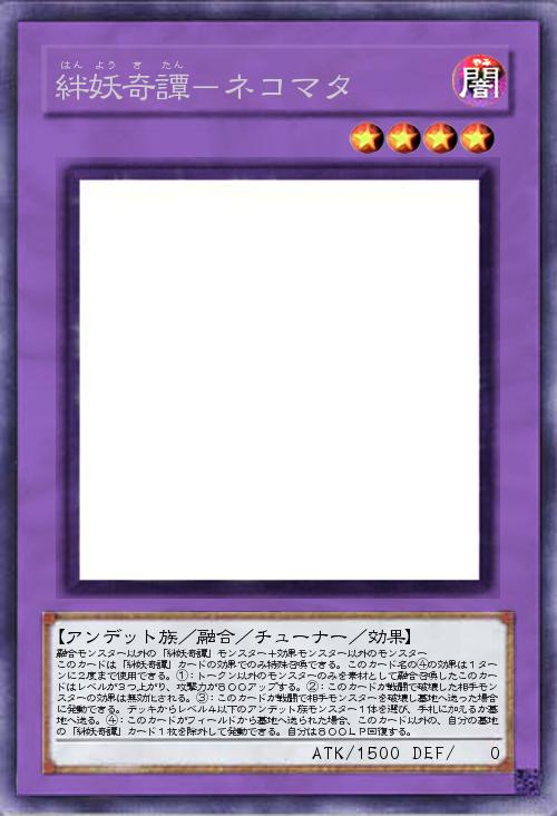 | 融合モンスター以外の「絆妖奇譚」モンスター+効果モンスター以外のモンスター このカードは「絆妖奇譚」カードの効果でのみ特殊召喚できる。このカード名の④の効果は1ターンに2度まで使用できる。①:トークン以外のモンスターのみを素材として融合召喚したこのカードはレベルが3つ上がり、攻撃力が800アップする。②:このカードが戦闘で破壊した相手モンスターの効果は無効化される。③:このカードが戦闘で相手モンスターを破壊し墓地へ送った場合に発動できる。デッキからレベル4以下のアンデット族モンスター1体を選び、手札に加えるか墓地へ送る。④:このカードがフィールドから墓地へ送られた場合、このカード以外の、自分の墓地の「絆妖奇譚」カード1枚を除外して発動できる。自分は800LP回復する。 | |||