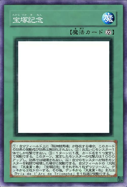 | ①:自分フィールド上に「阪神競馬場」が存在する場合、このカードの効果の発動及び効果は無効化されない。②:お互いにモンスター1体でしか攻撃できない。③:1ターンに1度、カード名を1つ宣言して発動できる。このターン、宣言したモンスターの攻撃力は1000アップし、効果では破壊されない。④:自分のモンスターが相手モンスターを戦闘で破壊した場合に発動できる。自分フィールドの「大阪杯」「天皇賞・春」「宝塚記念」をそれぞれ1枚ずつリリースし、デッキから2枚ドローする。その後、デッキから「天皇賞・秋」または「Prix de l'Arc de Triomphe」を1枚選び発動できる。 | |||