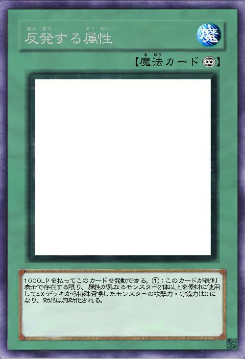 | 1000LPを払ってこのカードを発動できる。①:このカードが表側表示で存在する限り、属性が異なるモンスター2体以上を素材に使用してEXデッキから特殊召喚したモンスターの攻撃力・守備力は0になり、効果は無効化される。 | |||