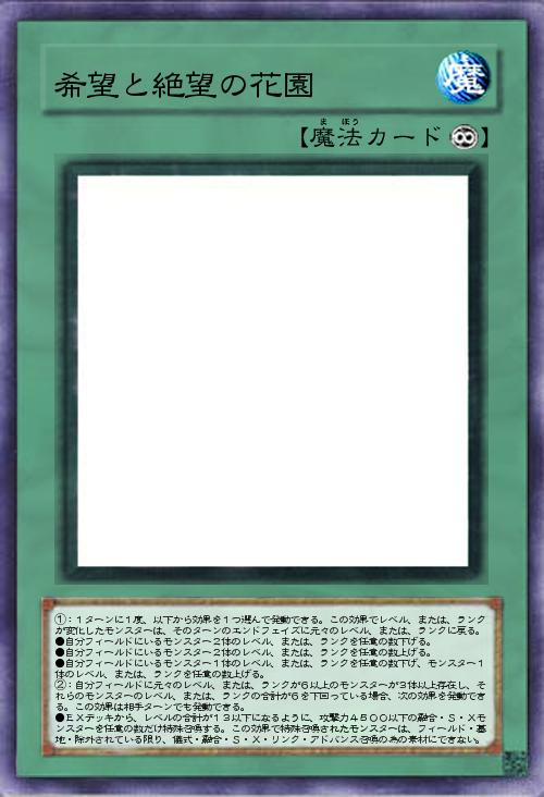| ①:1ターンに1度、以下から効果を1つ選んで発動できる。この効果でレベル、または、ランクが変化したモンスターは、そのターンのエンドフェイズに元々のレベル、または、ランクに戻る。 ●自分フィールドにいるモンスター2体のレベル、または、ランクを任意の数下げる。 ●自分フィールドにいるモンスター2体のレベル、または、ランクを任意の数上げる。 ●自分フィールドにいるモンスター1体のレベル、または、ランクを任意の数下げ、モンスター1体のレベル、または、ランクを任意の数上げる。 ②:自分フィールドに元々のレベル、または、ランクが6以上のモンスターが3体以上存在し、それらのモンスターのレベル、または、ランクの合計が6を下回っている場合、次の効果を発動できる。この効果は相手ターンでも発動できる。 ●EXデッキから、レベルの合計が13以下になるように、攻撃力4500以下の融合・S・Xモンスターを任意の数だけ | |||
