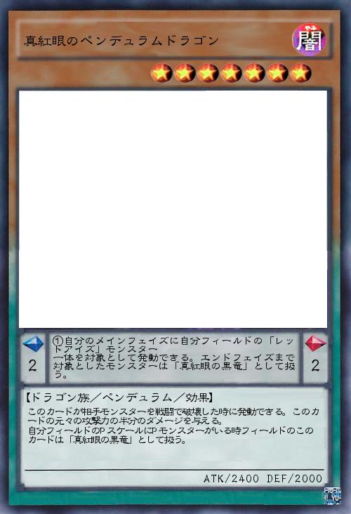 | このカードが相手モンスターを戦闘で破壊した時に発動できる。このカードの元々の攻撃力の半分のダメージを与える。 自分フィールドのPスケールにPモンスターがいる時フィールドのこのカードは「真紅眼の黒竜」として扱う。 | |||