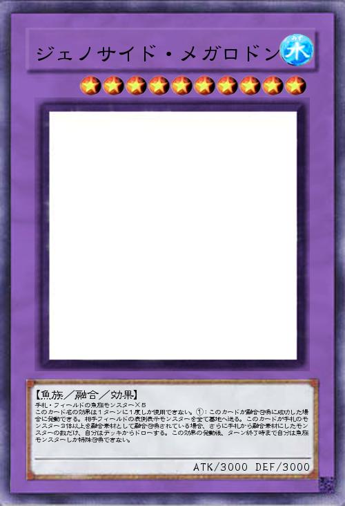 | 手札・フィールドの魚族モンスター×5 このカード名の効果は1ターンに1度しか使用できない。①:このカードが融合召喚に成功した場合に発動できる。相手フィールドの表側表示モンスターを全て墓地へ送る。このカードが手札のモンスター3体以上を融合素材として融合召喚されている場合、さらに手札から融合素材にしたモンスターの数だけ、自分はデッキからドローする。この効果の発動後、ターン終了時まで自分は魚族モンスターしか特殊召喚できない。 | |||