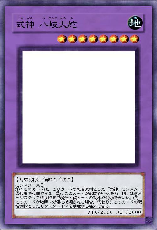 | モンスター×8 ①:このカードは、このカードの融合素材とした「式神」モンスターの数まで攻撃できる。②:このカードが戦闘を行う場合、相手はダメージステップ終了時まで魔法・罠カードの効果を発動できない。③:このカードが戦闘・効果で破壊される場合、代わりにこのカードの融合素材としたモンスター1体を墓地から除外できる。 | |||