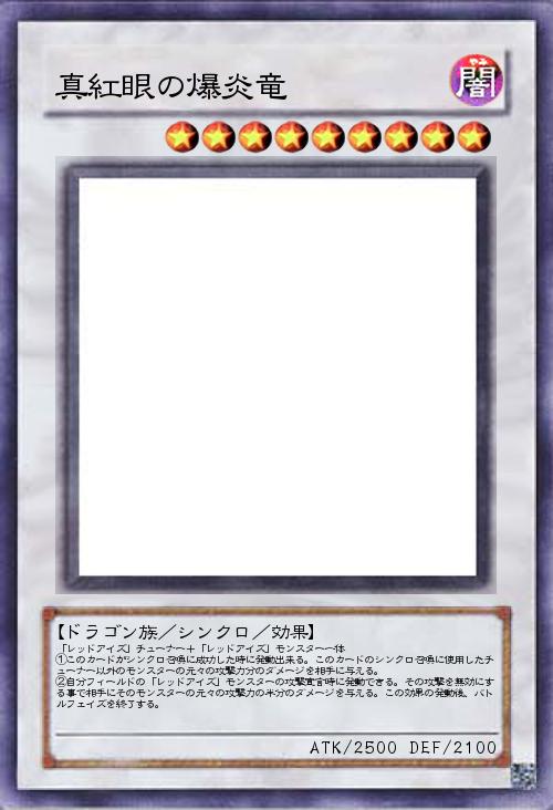 | 「レッドアイズ」チューナー+「レッドアイズ」モンスター一体 ①このカードがシンクロ召喚に成功した時に発動出来る。このカードのシンクロ召喚に使用したチューナー以外のモンスターの元々の攻撃力分のダメージを相手に与える。 ②自分フィールドの「レッドアイズ」モンスターの攻撃宣言時に発動できる。その攻撃を無効にする事で相手にそのモンスターの元々の攻撃力の半分のダメージを与える。この効果の発動後、バトルフェイズを終了する。 | |||