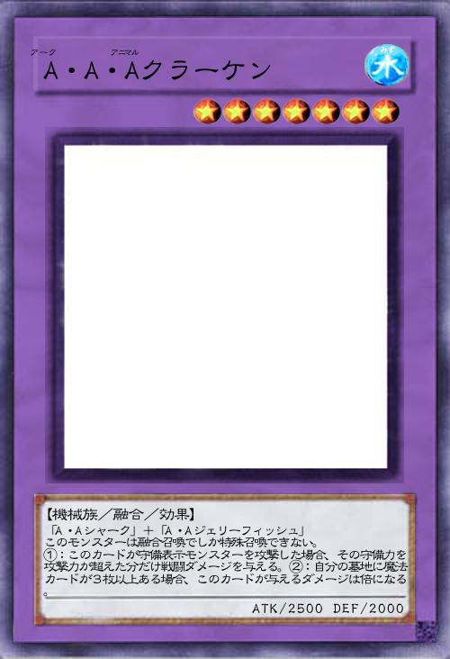 | 「A・Aシャーク」+「A・Aジェリーフィッシュ」 このモンスターは融合召喚でしか特殊召喚できない。 ①:このカードが守備表示モンスターを攻撃した場合、その守備力を攻撃力が超えた分だけ戦闘ダメージを与える。②:自分の墓地に魔法カードが3枚以上ある場合、このカードが与えるダメージは倍になる。 | |||