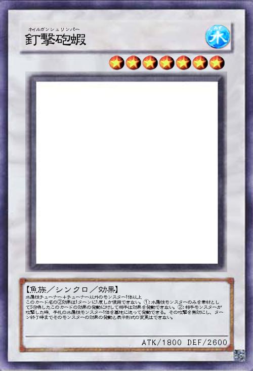 今回はくぎ打ち機とテッポウエビを合体させたカードを投稿します。名前は「ネイルガン+ガンスリンガー+シュリンプ(エビ)」から。攻撃してきた相手モンスターの身動きを瞬時に封じる効果を持ちます。さらにS素材によっては、相手のチェーン妨害を阻止することも可能です。」(2021-11-12 01:52)