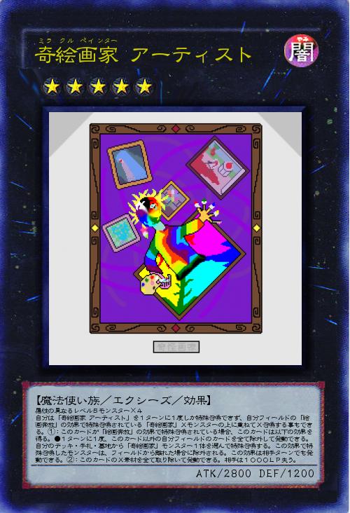 | 属性の異なるレベル5モンスター×4 自分は「奇絵画家 アーティスト」を1ターンに1度しか特殊召喚できず、自分フィールドの「絵画奔放」の効果で特殊召喚されている「奇絵画家」Xモンスターの上に重ねてX召喚する事もできる。①:このカードが「絵画奔放」の効果で特殊召喚されている場合、このカードは以下の効果を得る。●1ターンに1度、このカード以外の自分フィールドのカードを全て除外して発動できる。自分のデッキ・手札・墓地から「奇絵画家」モンスター1体を選んで特殊召喚する。この効果で特殊召喚したモンスターは、フィールドから離れた場合に除外される。この効果は相手ターンでも発動できる。②:このカードのX素材を全て取り除いて発動できる。相手は1000LP失う。 | |||