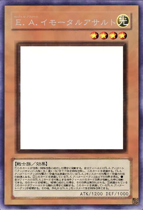 | ①このカードが召喚・特殊召喚に成功した場合に発動する。自分フィールドに「E.A.アバタートークン」(サイバース族・光・星4・攻/守?)1体を特殊召喚し、このカードを装備する。「E.A.アバタートークン」の攻撃力・守備力は装備されている「E.A.」モンスターの攻撃力・守備力の倍の数値となる。②このカードを装備している「E.A.アバタートークン」は以下の効果を得る。●自分フィールドの「E.A.」カードを対象とする相手フィールドのカード効果が発動した時に発動できる。そのカードを破壊し、破壊に成功した場合、その効果は無効化される。③装備されているこのカードがフィールドから離れた場合に発動する。このカードを装備していた「E.A.アバタートークン」を破壊する。その後、手札から「E.A.」モンスター1体を特殊召喚できる。 | |||