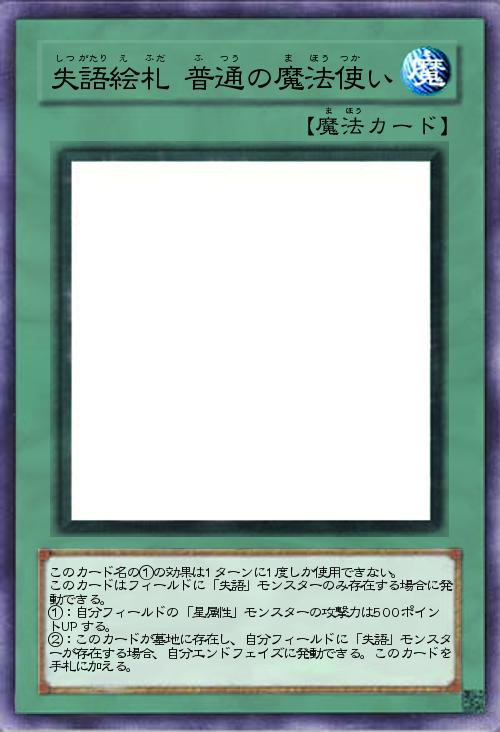 | このカード名の①の効果は1ターンに1度しか使用できない。 このカードはフィールドに「失語」モンスターのみ存在する場合に発動できる。 ①:自分フィールドの「星属性」モンスターの攻撃力は500ポイントUPする。 ②:このカードが墓地に存在し、自分フィールドに「失語」モンスターが存在する場合、自分エンドフェイズに発動できる。このカードを手札に加える。 | |||