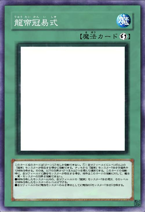 | このカード名のカードは1ターンに1枚しか発動できない。①:自分フィールドにレベル6以上の「龍帝」モンスターが存在する場合に発動できる。デッキから「龍帝」モンスター1体を守備表示で特殊召喚する。その後、以下の効果から1つまたは2つを選んで適用できる。このカードの発動時に、自分フィールドに融合モンスターが存在する場合、相手はこのカードの発動に対して、魔法・罠・モンスターの効果を発動できない。 ●特殊召喚したモンスター以外の、自分フィールドの「龍帝」モンスター1体を選び、そのレベルを特殊召喚したモンスターのレベル分下げる。 ●自分フィールドの幻竜族モンスターのみを素材として幻竜族のSモンスター1体をS召喚する。 | |||