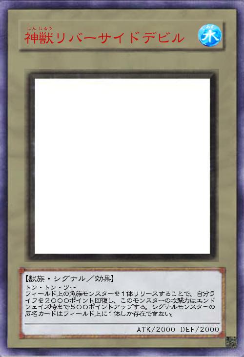 トン・トン・ツー フィールド上の魚族モンスターを1体リリースすることで、自分ライフを2000ポイント回復し、このモンスターの攻撃力はエンドフェイズ時まで500ポイントアップする。シグナルモンスターの同名カードはフィールド上に1体しか存在できない。 |