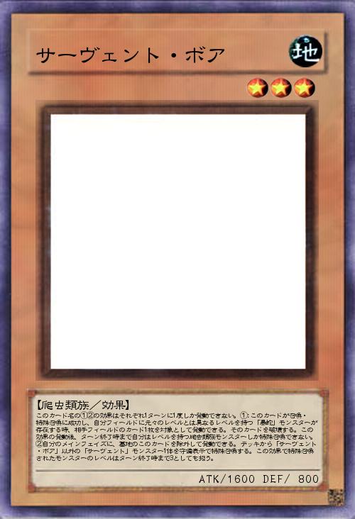 | このカード名の①②の効果はそれぞれ1ターンに1度しか発動できない。①:このカードが召喚・特殊召喚に成功し、自分フィールドに元々のレベルとは異なるレベルを持つ「暴蛇」モンスターが存在する時、相手フィールドのカード1枚を対象として発動できる。そのカードを破壊する。この効果の発動後、ターン終了時まで自分はレベルを持つ爬虫類族モンスターしか特殊召喚できない。②自分のメインフェイズに、墓地のこのカードを除外して発動できる。デッキから「サーヴェント・ボア」以外の「サーヴェント」モンスター1体を守備表示で特殊召喚する。この効果で特殊召喚されたモンスターのレベルはターン終了時まで3としても扱う。 | |||