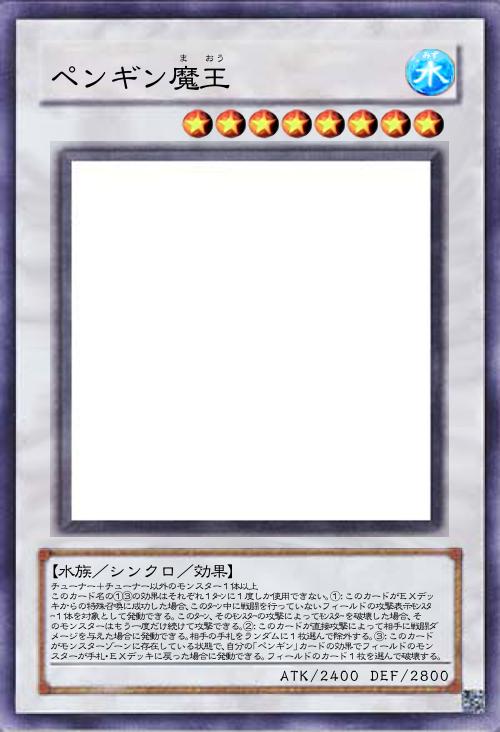 | チューナー+チューナー以外のモンスター1体以上 このカード名の①③の効果はそれぞれ1ターンに1度しか使用できない。①:このカードがEXデッキからの特殊召喚に成功した場合、このターン中に戦闘を行っていないフィールドの攻撃表示モンスター1体を対象として発動できる。このターン、そのモンスターの攻撃によってモンスターを破壊した場合、そのモンスターはもう一度だけ続けて攻撃できる。②:このカードが直接攻撃によって相手に戦闘ダメージを与えた場合に発動できる。相手の手札をランダムに1枚選んで除外する。③:このカードがモンスターゾーンに存在している状態で、自分の「ペンギン」カードの効果でフィールドのモンスターが手札・EXデッキに戻った場合に発動できる。フィールドのカード1枚を選んで破壊する。 | |||
