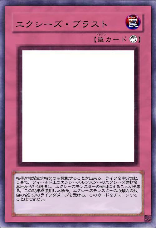 | 相手が攻撃宣言時にのみ発動することが出来る。ライフを半分支払う事で、フィールド上のエクシーズモンスターのエクシーズ素材を墓地から3枚選択し、エクシーズモンスターの素材にすることが出来る。この効果を使用した場合、エクシーズモンスターの攻撃力の数値の合計分のライフダメージを受ける。このカードをチェーンすることはできない。 | |||