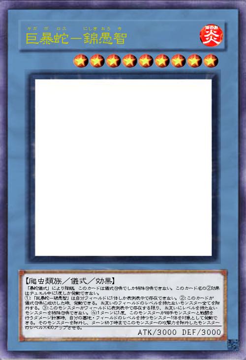 | 「暴蛇儀式」により降臨。このカードは儀式召喚でしか特殊召喚できない。このカード名の②効果はデュエル中に1度しか発動できない。 ①:「巨暴蛇-錦愚智」は自分フィールドに1体しか表側表示で存在できない。②:このカードが儀式召喚に成功した時、発動できる。お互いのフィールドのレベルを持たないモンスター全てを除外する。③:このモンスターがフィールドに表側表示で存在する限り、お互いにレベルを持たないモンスターを特殊召喚できない。④:1ターンに1度、このモンスターが相手モンスターと戦闘を行うダメージ計算時、自分の墓地・フィールドのレベルを持つモンスター1体を対象として発動できる。そのモンスターを除外し、ターン終了時までこのモンスターの攻撃力を除外したモンスターのレベル×400アップさせる。 | |||