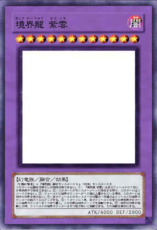 | 「幻離の賢者」+「境界龍」融合モンスター×3+「式神」モンスター×5 このカードは融合召喚でしか特殊召喚できない。①:「境界龍 紫雲」は自分フィールドに1体しか表側表示で存在できない。②:このカードがモンスターゾーンに存在する限り、このカードはリリースできない。③:フィールドに結界カウンターが10個以上置かれている場合、このカードは相手の効果を受けない。④:自分フィールドのモンスターの攻撃力・守備力はフィールドの結界カウンターの数×100アップする。⑤:1ターンに1度、自分フィールドの全ての表側表示のカードに結界カウンターを1つずつ置く。この効果は相手ターンでも発動できる。⑥:相手の効果が発動した時、フィールドの結界カウンターを5つ取り除いて発動できる。その発動を無効にする。 | |||