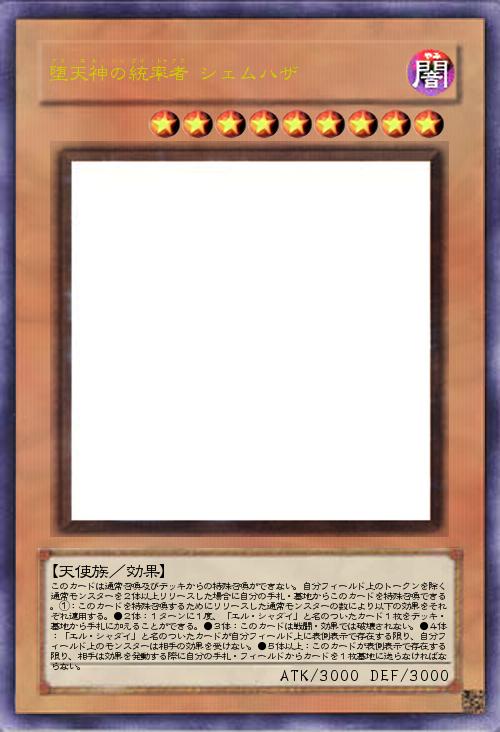 | このカードは通常召喚及びデッキからの特殊召喚ができない。自分フィールド上のトークンを除く通常モンスターを2体以上リリースした場合に自分の手札・墓地からこのカードを特殊召喚できる。①:このカードを特殊召喚するためにリリースした通常モンスターの数により以下の効果をそれぞれ適用する。●2体:1ターンに1度、「エル・シャダイ」と名のついたカード1枚をデッキ・墓地から手札に加えることができる。●3体:このカードは戦闘・効果では破壊されない。●4体:「エル・シャダイ」と名のついたカードが自分フィールド上に表側表示で存在する限り、自分フィールド上のモンスターは相手の効果を受けない。●5体以上:このカードが表側表示で存在する限り、相手は効果を発動する際に自分の手札・フィールドからカードを1枚墓地に送らなければならない。 | |||