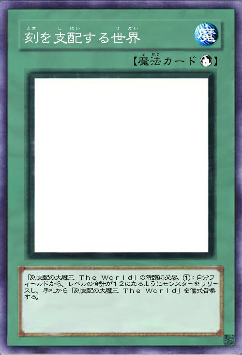 | 「刻支配の大魔王 The World」の降臨に必要。①:自分フィールドから、レベルの合計が12になるようにモンスターをリリースし、手札から「刻支配の大魔王 The World」を儀式召喚する。 | |||