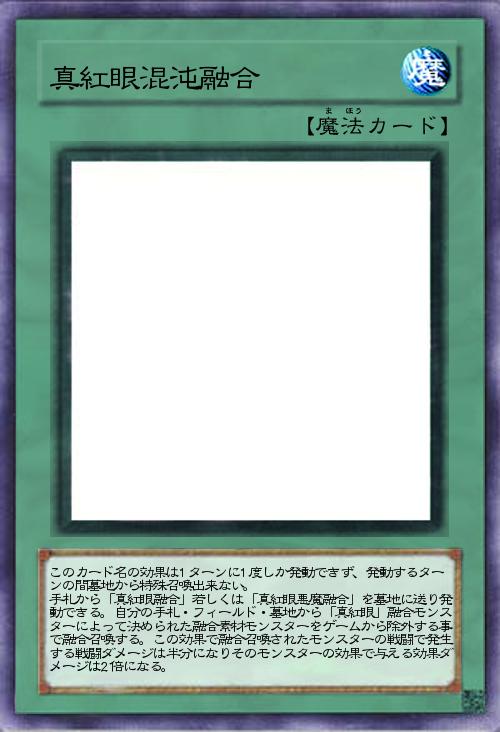 | このカード名の効果は1ターンに1度しか発動できず、発動するターンの間墓地から特殊召喚出来ない。 手札から「真紅眼融合」若しくは「真紅眼悪魔融合」を墓地に送り発動できる。自分の手札・フィールド・墓地から「真紅眼」融合モンスターによって決められた融合素材モンスターをゲームから除外する事で融合召喚する。この効果で融合召喚されたモンスターの戦闘で発生する戦闘ダメージは半分になりそのモンスターの効果で与える効果ダメージは2倍になる。 | |||