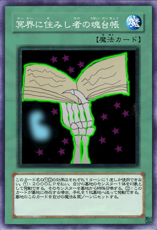 「冥界の住人の名前を書くことで、その名前が書かれた者の魂を冥界から引っ張って来て、呼び起こすことができる台帳という設定のカードです。