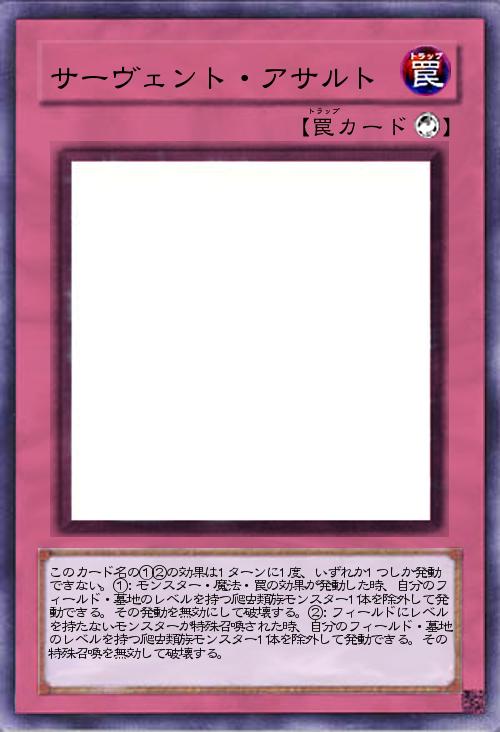 | このカード名の①②の効果は1ターンに1度、いずれか1つしか発動できない。①:モンスター・魔法・罠の効果が発動した時、自分のフィールド・墓地のレベルを持つ爬虫類族モンスター1体を除外して発動できる。その発動を無効にして破壊する。②:フィールドにレベルを持たないモンスターが特殊召喚された時、自分のフィールド・墓地のレベルを持つ爬虫類族モンスター1体を除外して発動できる。その特殊召喚を無効して破壊する。 | |||