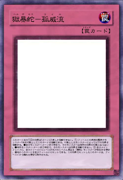 | このカード名の①②の効果は1ターンに1度しか発動できない。①:フィールドの表側攻撃表示モンスター1体を対象としてこのカードを発動できる。対象としたモンスターによって以下の効果を発動する。●自分モンスター:ターン終了時まで、そのモンスターは相手の効果の対象にならない。●相手モンスター:ターン終了時まで、そのモンスターは効果を発動できない。②:自分メインフェイズに、自分フィールドにレベルが元々のレベルと異なる「暴蛇」モンスターが存在する場合、墓地のこのカードを自分フィールドにセットできる。この効果でセットしたこのカードは、フィールドから離れた場合に除外される。 | |||