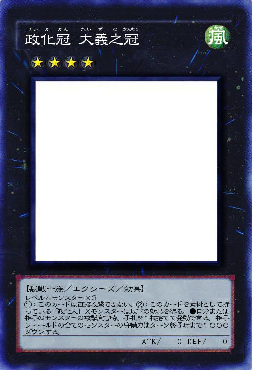 | レベル4モンスター×3 ①:このカードは直接攻撃できない。②:このカードを素材として持っている「政化人」Xモンスターは以下の効果を得る。●自分または相手のモンスターの攻撃宣言時、手札を1枚捨てて発動できる。相手フィールドの全てのモンスターの守備力はターン終了時まで1000ダウンする。 | |||