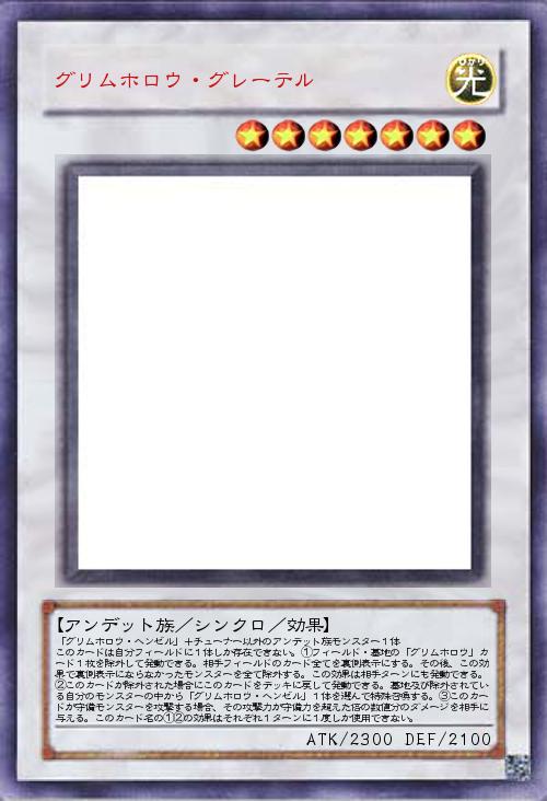 | 「グリムホロウ・ヘンゼル」+チューナー以外のアンデット族モンスター1体 このカードは自分フィールドに1体しか存在できない。①フィールド・墓地の「グリムホロウ」カード1枚を除外して発動できる。相手フィールドのカード全てを裏側表示にする。その後、この効果で裏側表示にならなかったモンスターを全て除外する。この効果は相手ターンにも発動できる。②このカードが除外された場合にこのカードをデッキに戻して発動できる。墓地及び除外されている自分のモンスターの中から「グリムホロウ・ヘンゼル」1体を選んで特殊召喚する。③このカードが守備モンスターを攻撃する場合、その攻撃力が守備力を超えた倍の数値分のダメージを相手に与える。このカード名の①②の効果はそれぞれ1ターンに1度しか使用できない。 | |||