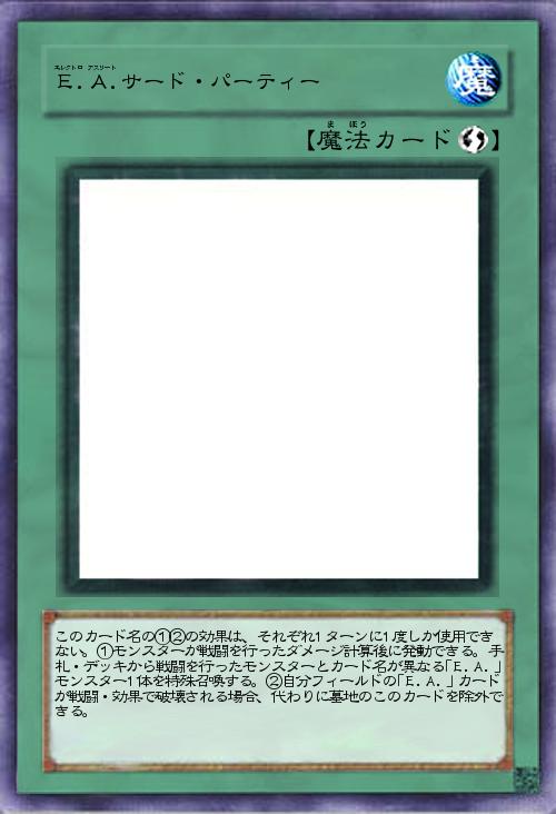 | このカード名の①②の効果は、それぞれ1ターンに1度しか使用できない。①モンスターが戦闘を行ったダメージ計算後に発動できる。手札・デッキから戦闘を行ったモンスターとカード名が異なる「E.A.」モンスター1体を特殊召喚する。②自分フィールドの「E.A.」カードが戦闘・効果で破壊される場合、代わりに墓地のこのカードを除外できる。 | |||