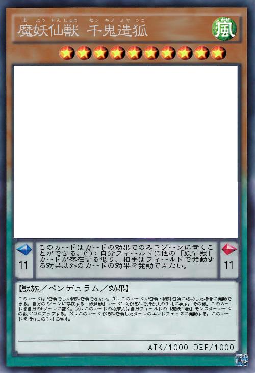 | このカードはP召喚でしか特殊召喚できない。①:このカードが召喚・特殊召喚に成功した場合に発動できる。自分のPゾーンに存在する「妖仙獣」カード1枚を選んで持ち主の手札に戻す。その後、このカードを自分のPゾーンに置く。②:このカードの攻撃力は自分フィールドの「魔妖仙獣」モンスターカードの数×1000アップする。③:このカードを特殊召喚したターンのエンドフェイズに発動する。このカードを持ち主の手札に戻す。 | |||