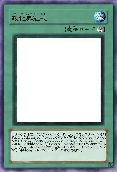 | 1ターンに1度、自分フィールドの「政化人」Xモンスター1体を対象として発動できる。自分のEXデッキ・墓地からそのモンスターよりランクが低い「政化冠」Xモンスター1体を選び、このカードの下に重ねてX素材とする。②:このカードが破壊された時に発動できる。自分フィールドのランクが一番高いモンスターよりレベル・ランクが低い相手フィールドのモンスターを全て破壊する。 | |||