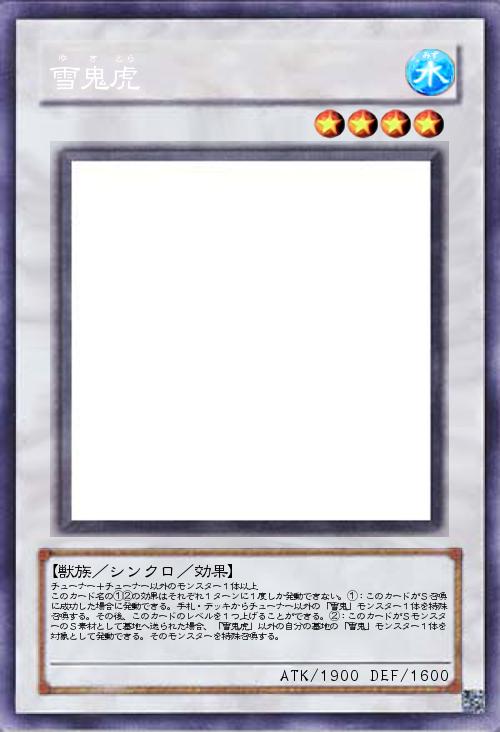 | チューナー+チューナー以外のモンスター1体以上 このカード名の①②の効果はそれぞれ1ターンに1度しか発動できない。①:このカードがS召喚に成功した場合に発動できる。手札・デッキからチューナー以外の「雪鬼」モンスター1体を特殊召喚する。その後、このカードのレベルを1つ上げることができる。②:このカードがSモンスターのS素材として墓地へ送られた場合、「雪鬼虎」以外の自分の墓地の「雪鬼」モンスター1体を対象として発動できる。そのモンスターを特殊召喚する。 | |||