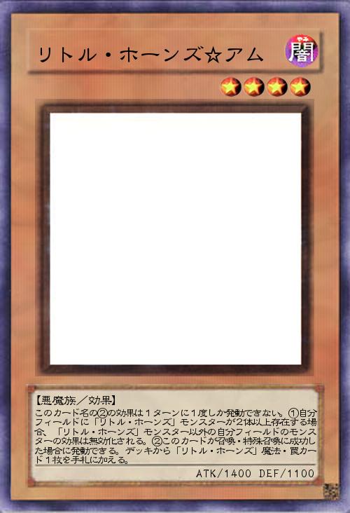 | このカード名の②の効果は1ターンに1度しか発動できない。①自分フィールドに「リトル・ホーンズ」モンスターが2体以上存在する場合、「リトル・ホーンズ」モンスター以外の自分フィールドのモンスターの効果は無効化される。②このカードが召喚・特殊召喚に成功した場合に発動できる。デッキから「リトル・ホーンズ」魔法・罠カード1枚を手札に加える。 | |||