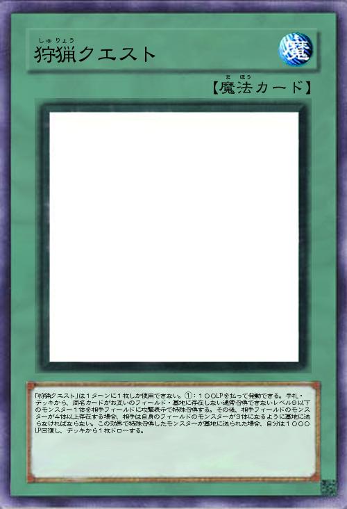 | 「狩猟クエスト」は1ターンに1枚しか使用できない。①:100LPを払って発動できる。手札・デッキから、同名カードがお互いのフィールド・墓地に存在しない通常召喚できないレベル9以下のモンスター1体を相手フィールドに攻撃表示で特殊召喚する。その後、相手フィールドのモンスターが4体以上存在する場合、相手は自身のフィールドのモンスターが3体になるように墓地に送らなければならない。この効果で特殊召喚したモンスターが墓地に送られた場合、自分は1000LP回復し、デッキから1枚ドローする。 | |||