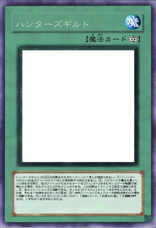 | 「ハンターズギルド」の③④の効果はそれぞれ1ターンに1度しか使用できない。①:「ハンターズギルド」は自分フィールドに1枚しか表側表示で存在できない。②:このカードが魔法&罠ゾーンに存在する限り、自分フィールドの元々のカード名に「ハンター」を含むモンスターが戦闘で破壊される場合、代わりに300LP払うことができる。この効果は1ターンに2度まで適用できる。③:自分メインフェイズに発動できる。デッキから「クエスト」カード1枚を手札に加える。その後、手札を1枚持ち主のデッキに戻す。④:相手フィールドにモンスターが特殊召喚された場合に発動できる。デッキから「ハンター」モンスター、「猟具」カード、「武具加工屋」、「古龍観測所」の内、いずれか1枚を手札に加える。 | |||