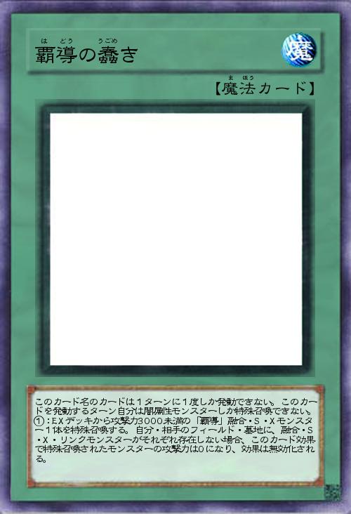 | このカード名のカードは1ターンに1度しか発動できない。このカードを発動するターン自分は闇属性モンスターしか特殊召喚できない。①:EXデッキから攻撃力3000未満の「覇導」融合・S・Xモンスター1体を特殊召喚する。自分・相手のフィールド・墓地に、融合・S・X・リンクモンスターがそれぞれ存在しない場合、このカード効果で特殊召喚されたモンスターの攻撃力は0になり、効果は無効化される。 | |||