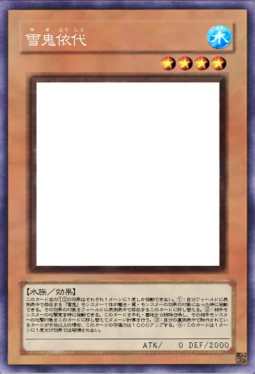| このカード名の①②の効果はそれぞれ1ターンに1度しか発動できない。①:自分フィールドに表側表示で存在する「雪鬼」モンスター1体が魔法・罠・モンスターの効果の対象になった時に発動できる。その効果の対象をフィールドに表側表示で存在するこのカードに移し替える。②:相手モンスターの攻撃宣言時に発動できる。このカードを手札・墓地から特殊召喚し、その相手モンスターの攻撃対象をこのカードに移し替えてダメージ計算を行う。③:自分の裏側表示で除外されているカードが5枚以上の場合、このカードの守備力は1000アップする。④:このカードは1ターンに1度だけ効果では破壊されない。 | |||