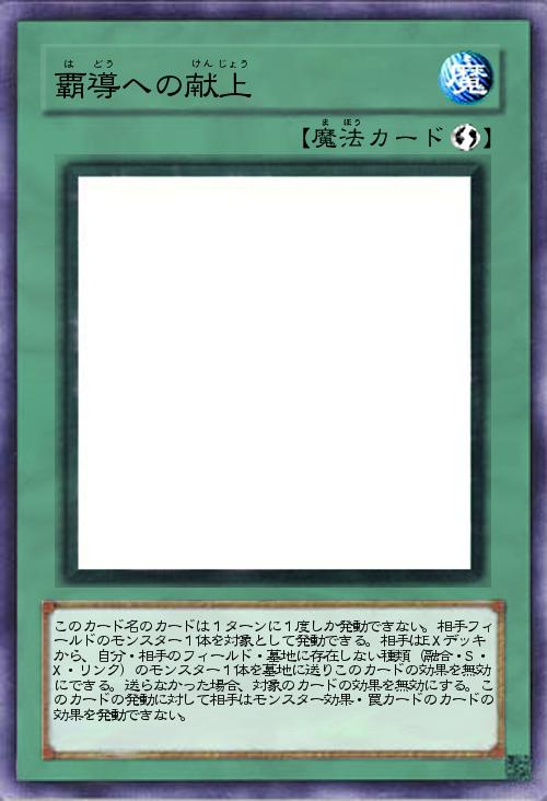| このカード名のカードは1ターンに1度しか発動できない。相手フィールドのモンスター1体を対象として発動できる。相手はEXデッキから、自分・相手のフィールド・墓地に存在しない種類(融合・S・X・リンク)のモンスター1体を墓地に送りこのカードの効果を無効にできる。送らなかった場合、対象のカードの効果を無効にする。このカードの発動に対して相手はモンスター効果・罠カードのカードの効果を発動できない。 | |||