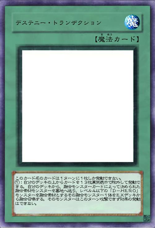 | このカード名のカードは1ターンに1枚しか発動できない。 ①:自分のデッキの上からカードを13枚裏側表示で除外して発動できる。自分のデッキから、融合モンスターカードによって決められた融合素材モンスターを墓地へ送り、レベル4以下の「D-HERO」モンスターを融合素材とするその融合モンスター1体をEXデッキから融合召喚する。そのモンスターはこのターン攻撃できず効果の発動はできない。 | |||