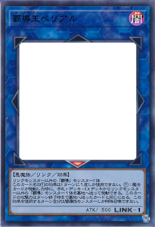 | リンクモンスター以外の「覇導」モンスター1体 このカード名の①の効果は1ターンに1度しか使用できない。①:魔法カードが発動した時に、手札・デッキ・EXデッキからリンクモンスター以外の「覇導」モンスター1体を墓地へ送って発動できる。このカードの攻撃力はターン終了時まで墓地へ送ったカードと同じになる。この効果を使用するターン自分は闇属性モンスターしか特殊召喚できない。 | |||