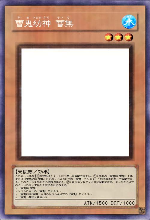 | このカード名の①②の効果は1ターンに1度しか発動できない。①:手札の「雪鬼神 雪那」1体または「雪鬼幼神 雪無」以外のレベル3以下の「雪鬼」モンスター1体を相手に見せて発動できる。このカードを手札から特殊召喚する。②:自分エンドフェイズに発動できる。デッキから以下のカードの内いずれか1枚を手札に加える。 ・「雪鬼神 雪那」 ・レベル8以上の「雪鬼」モンスター ・「雪鬼幼神 雪無」以外のレベル4以下の「雪鬼」モンスター ・「雪鬼」魔法・罠カード | |||