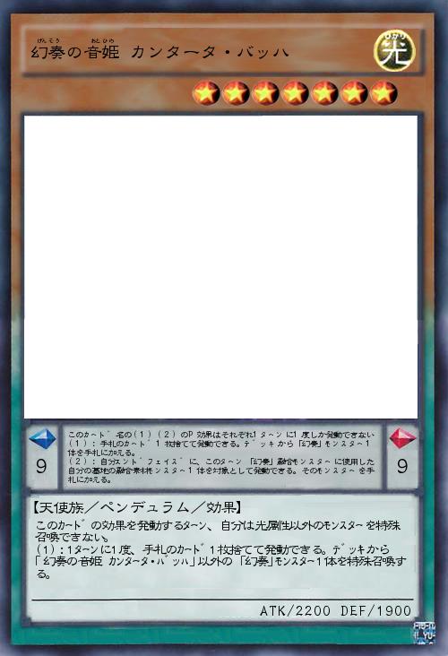 | このカードの効果を発動するターン、自分は光属性以外のモンスターを特殊召喚できない。 (1):1ターンに1度、手札のカード1枚捨てて発動できる。デッキから 「幻奏の音姫 カンタータ・バッハ」以外の「幻奏」モンスター1体を特殊召喚する。 | |||