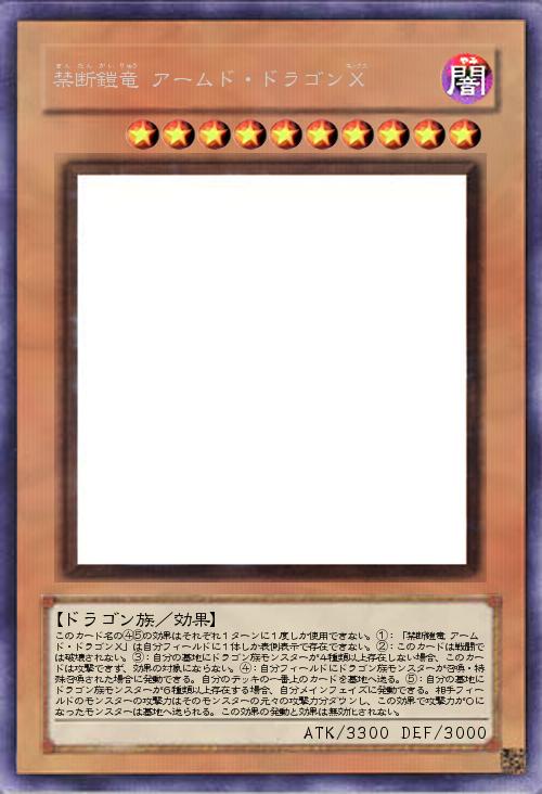 | このカード名の④⑤の効果はそれぞれ1ターンに1度しか使用できない。①:「禁断鎧竜 アームド・ドラゴンX」は自分フィールドに1体しか表側表示で存在できない。②:このカードは戦闘では破壊されない。③:自分の墓地にドラゴン族モンスターが4種類以上存在しない場合、このカードは攻撃できず、効果の対象にならない。④:自分フィールドにドラゴン族モンスターが召喚・特殊召喚された場合に発動できる。自分のデッキの一番上のカードを墓地へ送る。⑤:自分の墓地にドラゴン族モンスターが6種類以上存在する場合、自分メインフェイズに発動できる。相手フィールドのモンスターの攻撃力はそのモンスターの元々の攻撃力分ダウンし、この効果で攻撃力が0になったモンスターは墓地へ送られる。この効果の発動と効果は無効化されない。 | |||