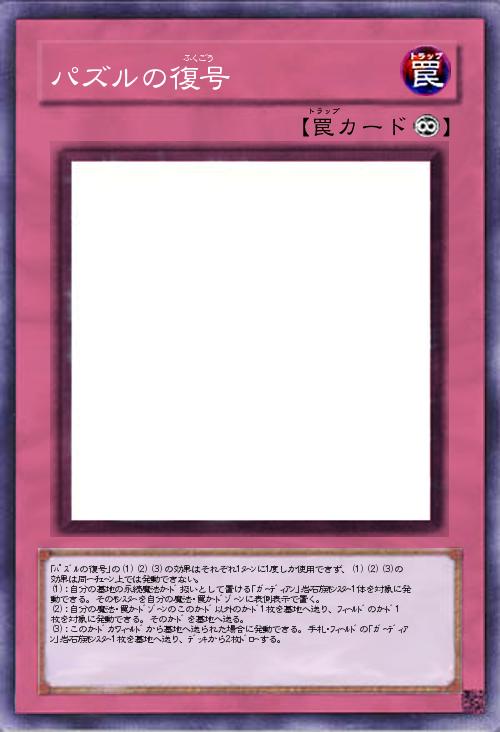 | 「パズルの復号」の(1)(2)(3)の効果はそれぞれ1ターンに1度しか使用できず、(1)(2)(3)の効果は同一チェーン上では発動できない。 (1):自分の墓地の永続魔法カード扱いとして置ける「ガーディアン」岩石族モンスター1体を対象に発動できる。そのモンスターを自分の魔法・罠カードゾーンに表側表示で置く。 (2):自分の魔法・罠カードゾーンのこのカード以外のカード1枚を墓地へ送り、フィールドのカード1枚を対象に発動できる。そのカードを墓地へ送る。 (3):このカードがフィールドから墓地へ送られた場合に発動できる。手札・フィールドの「ガーディアン」岩石族モンスター1枚を墓地へ送り、デッキから2枚ドローする。 | |||