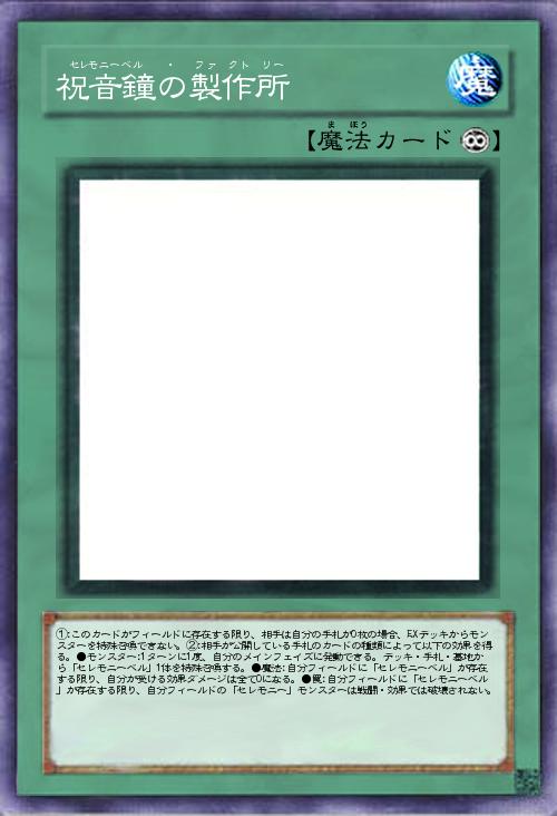 | ①:このカードがフィールドに存在する限り、相手は自分の手札が0枚の場合、EXデッキからモンスターを特殊召喚できない。②:相手が公開している手札のカードの種類によって以下の効果を得る。●モンスター:1ターンに1度、自分のメインフェイズに発動できる。デッキ・手札・墓地から「セレモニーベル」1体を特殊召喚する。●魔法:自分フィールドに「セレモニーベル」が存在する限り、自分が受ける効果ダメージは全て0になる。●罠:自分フィールドに「セレモニーベル」が存在する限り、自分フィールドの「セレモニー」モンスターは戦闘・効果では破壊されない。 | |||