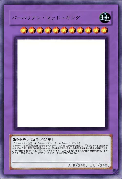 「バーバリアンがカテゴリー化するとのことなので作ってみたバーバリアンの融合モンスター。融合素材は初期にいたバーバリアン1号と2号、来月のパックに収録される0号です。攻守とレベルは融合素材である三体のものを合計したものにしてあります。」(2021-12-25 01:25)