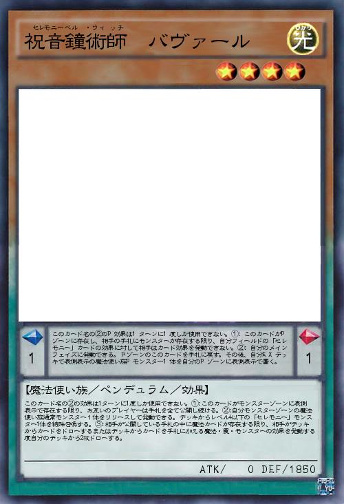 | このカード名の②のP効果は1ターンに1度しか使用できない。①:このカードがPゾーンに存在し、相手の手札にモンスターが存在する限り、自分フィールドの「セレモニー」カードの効果に対して相手はカード効果を発動できない。②:自分のメインフェイズに発動できる。Pゾーンのこのカードを手札に戻す。その後、自分EXデッキで表側表示の魔法使い族Pモンスター1体を自分のPゾーンに表側表示で置く。 | |||